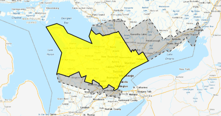 The warning stretches from the Greater Toronto Area westwards towards Georgian Bay and Lake Huron. Those areas to the west are expected to see more snowfall amounts of up to 15 centimetres.