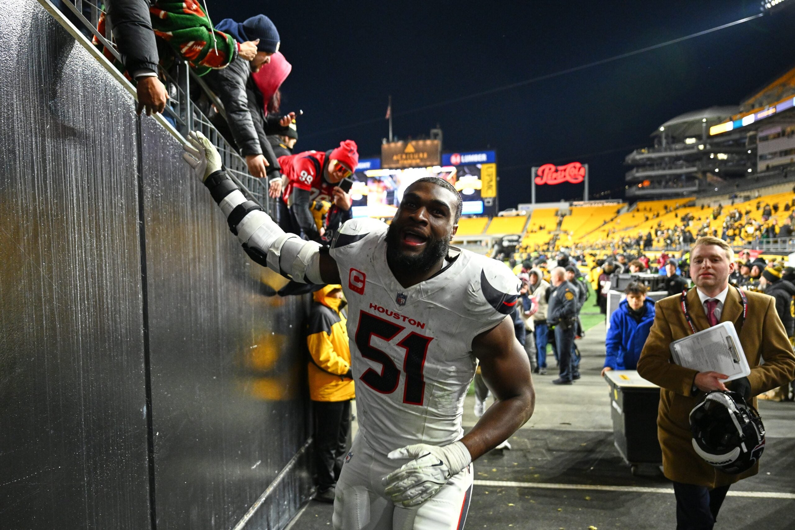 Anderson, the No. 3 overall pick out of Alabama in 2023 — a pick after the Texans selected Stroud — is a force of nature, a powerful and impossibly quick end who finished with 12 sacks, 23 quarterback hits, and 3 forced fumbles during the regular season. Against the Steelers, he contributed a half-sack, a forced fumble, and laid three QB hits on Aaron Rodgers, who looked ready to begin his inevitable next career as a gasbag podcast host before the fourth quarter was half over.